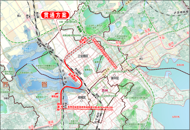 如通苏湖城际铁路苏州北站至苏州东站段,线路长度34.918公里,设计时速160公里/小时。新建车站3座,分别为苏州北站、苏州园区站、苏州东站,设动车运用所1座,途经吴中区、相城区、苏州工业园区。如通苏湖城际铁路苏州北站至苏州东站段先期实施段主要包括与新建南通至宁波铁路动走线并行段、桑田岛隧道段。